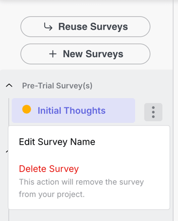 - For Pre / Post Trial Surveys, hover over the individual survey that you'd like to update until the menu appears on the right. Clicking on this menu will allow you to update the name of each survey individually.