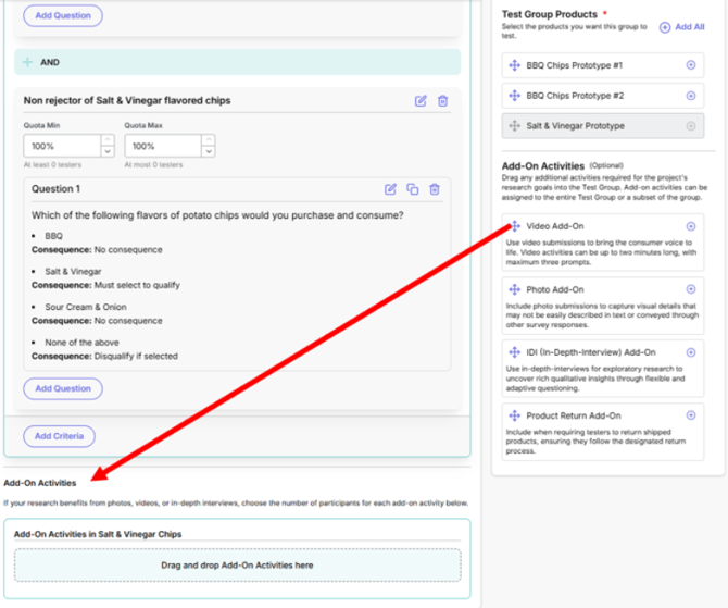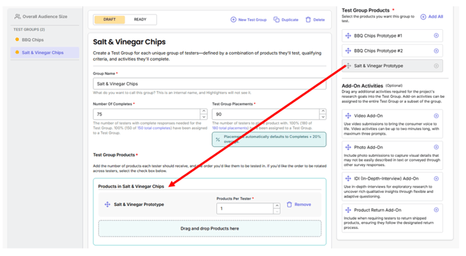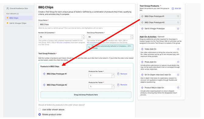 In the Test Group Products section, drag and drop the products for each test group and select how you want them tested (rotated or in order shown). In this example, the BBQ chips group will test two chip products using a rotated order, while the Salt & Vinegar group will test a single chip product.