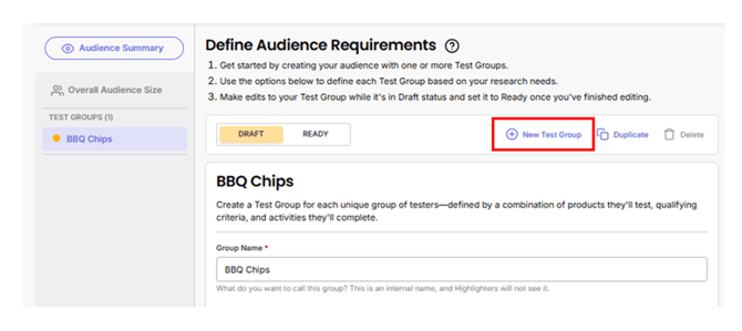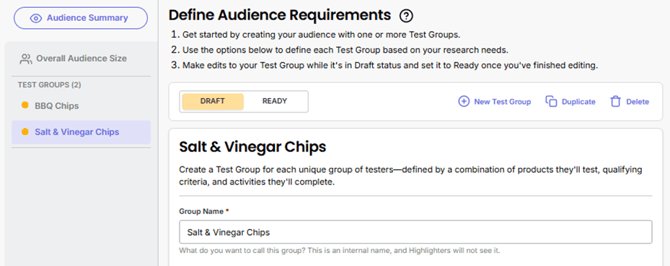 Create a Test Group for each unique group of testers—defined by a combination of products they'll test, qualifying criteria, and activities they'll complete.