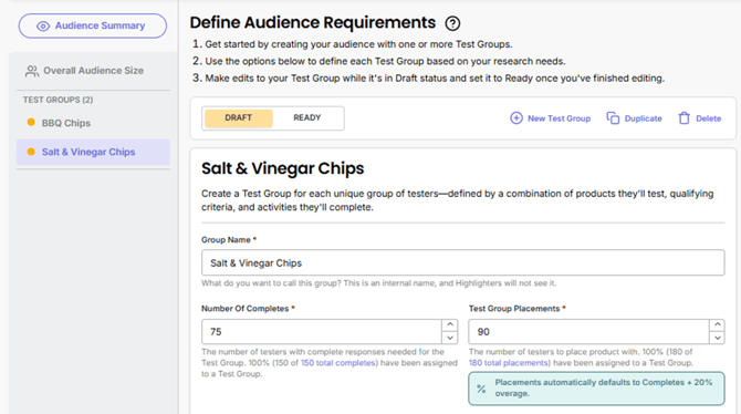 Enter completes for each group. The platform will auto-add 20% overage for the number of placements. In this example, the audience is split evenly - 50% (75 completes) for BBQ Chips, and 50% (75 completes) for Salt & Vinegar Chips.