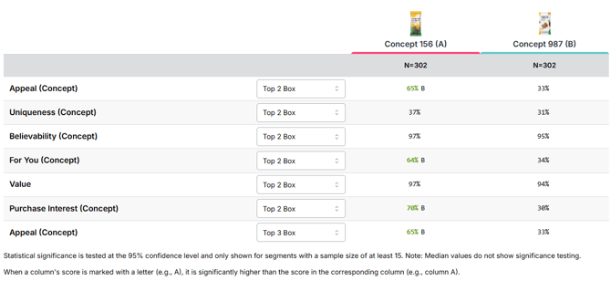 - If a value appears in green and there’s a letter next to it, that means the result is statistically higher than another column (concept/product) at your chosen confidence level. (e.g., "B" means the particular column score is higher than concept/ product scores in column B).